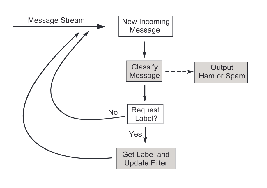 The returned boolean indicates whether or not a label should be asked for. In a production system, we could feed this to a web interface, and get the human to annotate the sample. Offline, we can simply use the label in the dataset.