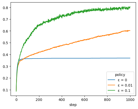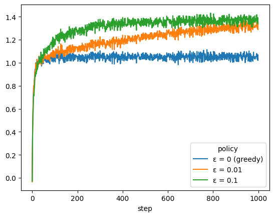 It is then straightforward to plot the average reward each policy obtains at each step, by averaging over episodes.